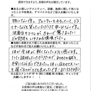 より良い施術、サービスのために今後とも様々なご意見、ご感想をいただけますと幸いです。